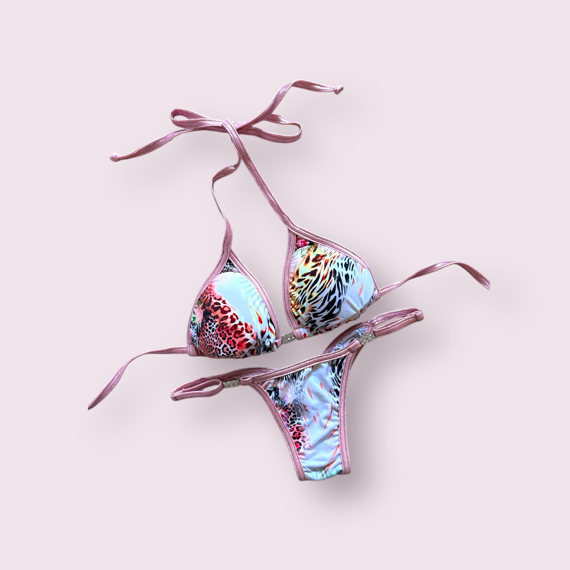 Hand washes separately, cold water, mild detergent. No chlorine bleach. Do not rub fabric together. Lay flat to dry, do not wring. Don’t not iron or dry clean. Bright and dark colors may bleed. Test for chlorine/ sweat sensitivity. The foil finish may fade after wear and washing.