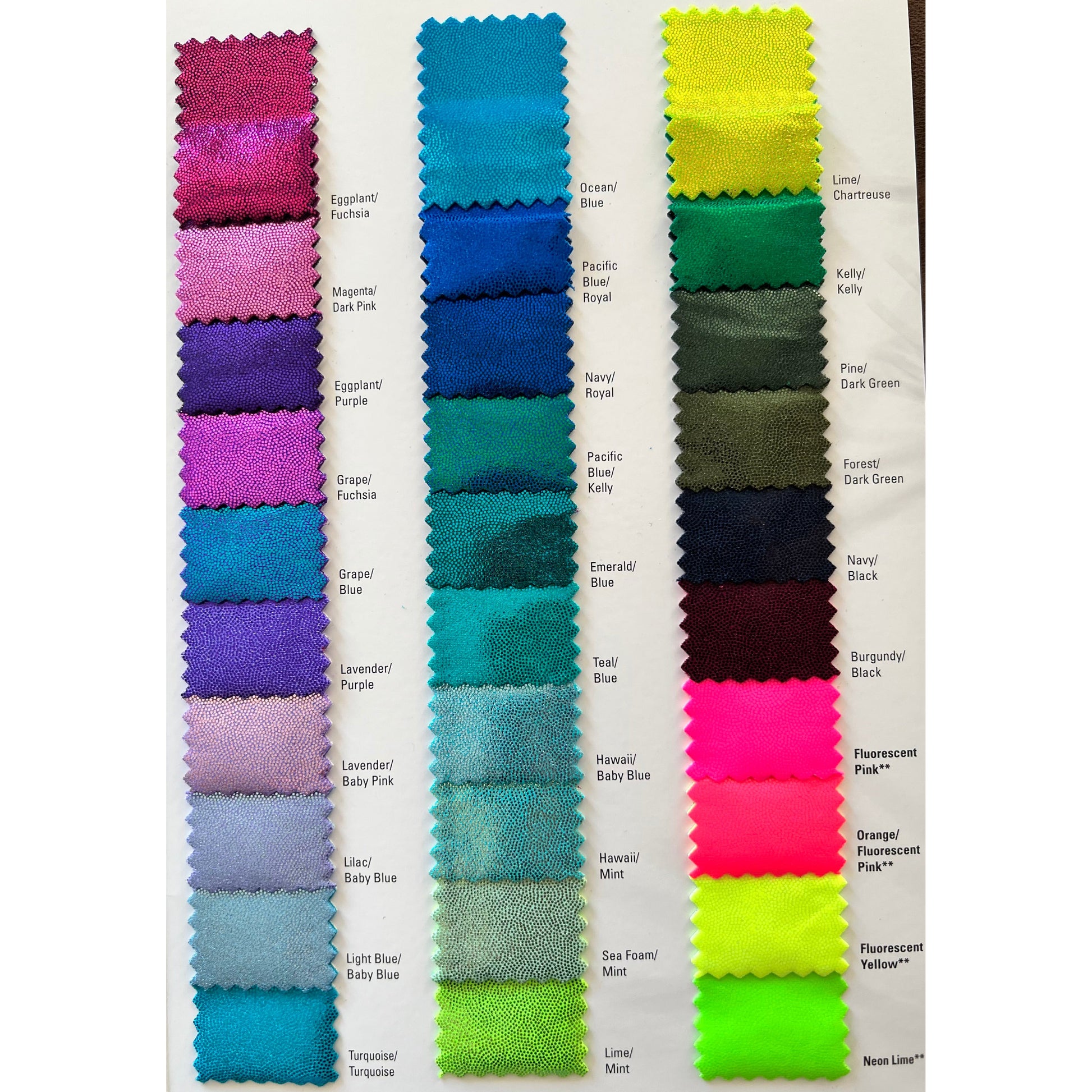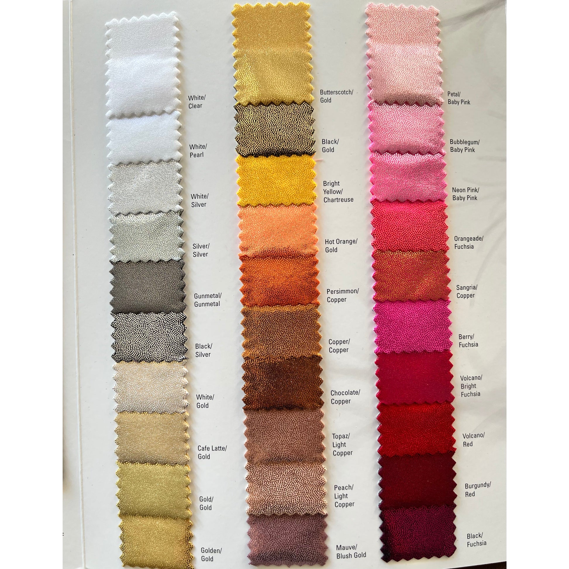 Fabric Care and Use: Hand washes separately, cold water, mild detergent. No chlorine bleach. Do not rub fabric together. Lay flat to dry, do not wring. Don’t not iron or dry clean. Bright and dark colors may bleed. Test for chlorine/ sweat sensitivity. The foil finish may fade after wear and washing. Fabric Content: 80% Nylon 20% Spandex