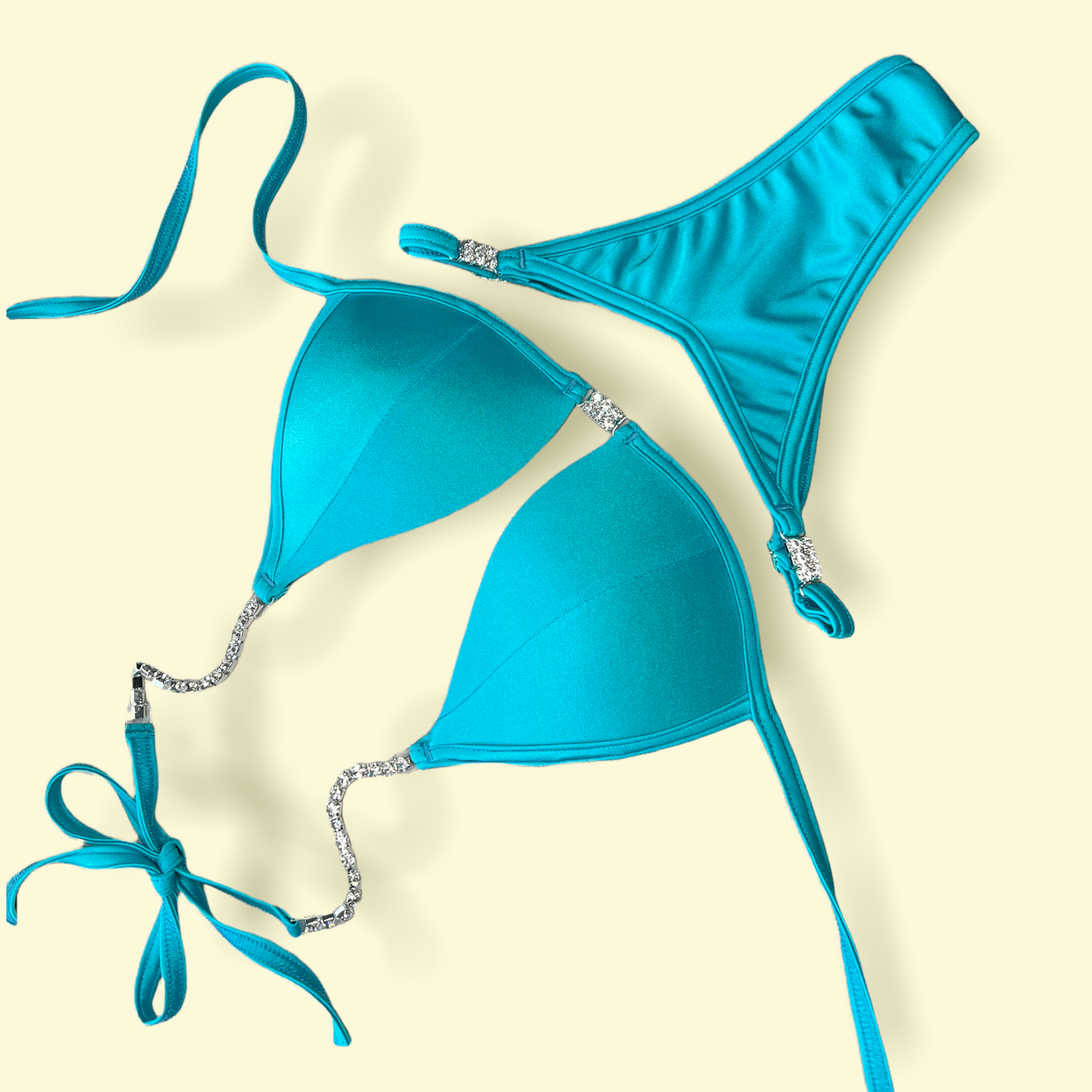 Hand washes separately, cold water, mild detergent. No chlorine bleach. Do not rub fabric together. Lay flat to dry, do not wring. Don’t not iron or dry clean. Bright and dark colors may bleed. Test for chlorine/ sweat sensitivity. The foil finish may fade after wear and washing.
