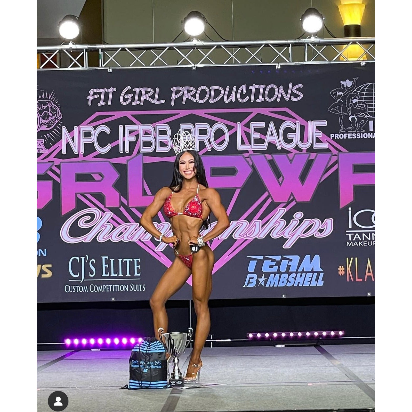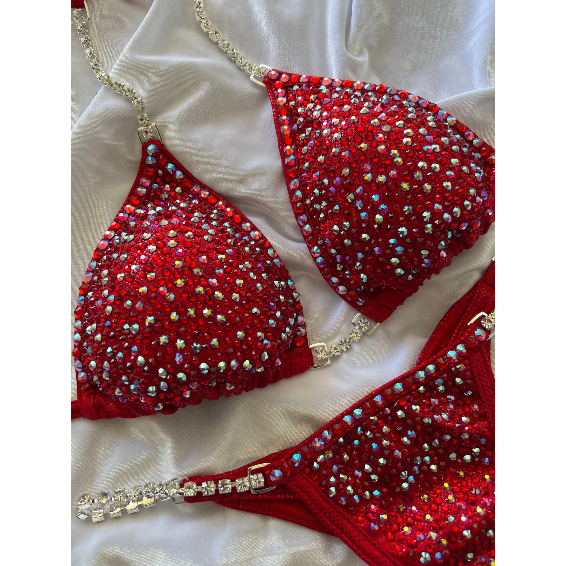 Camryn’s Fire engine red full scatter suit with trimmed crystal edge